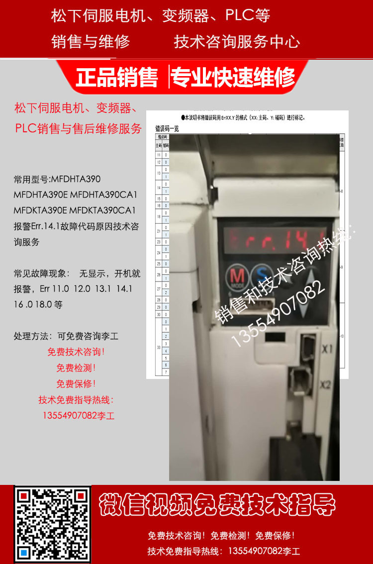 松下伺服驱动器维修MFDHTB3A2CA1报Err 14.0过载电流快速维修