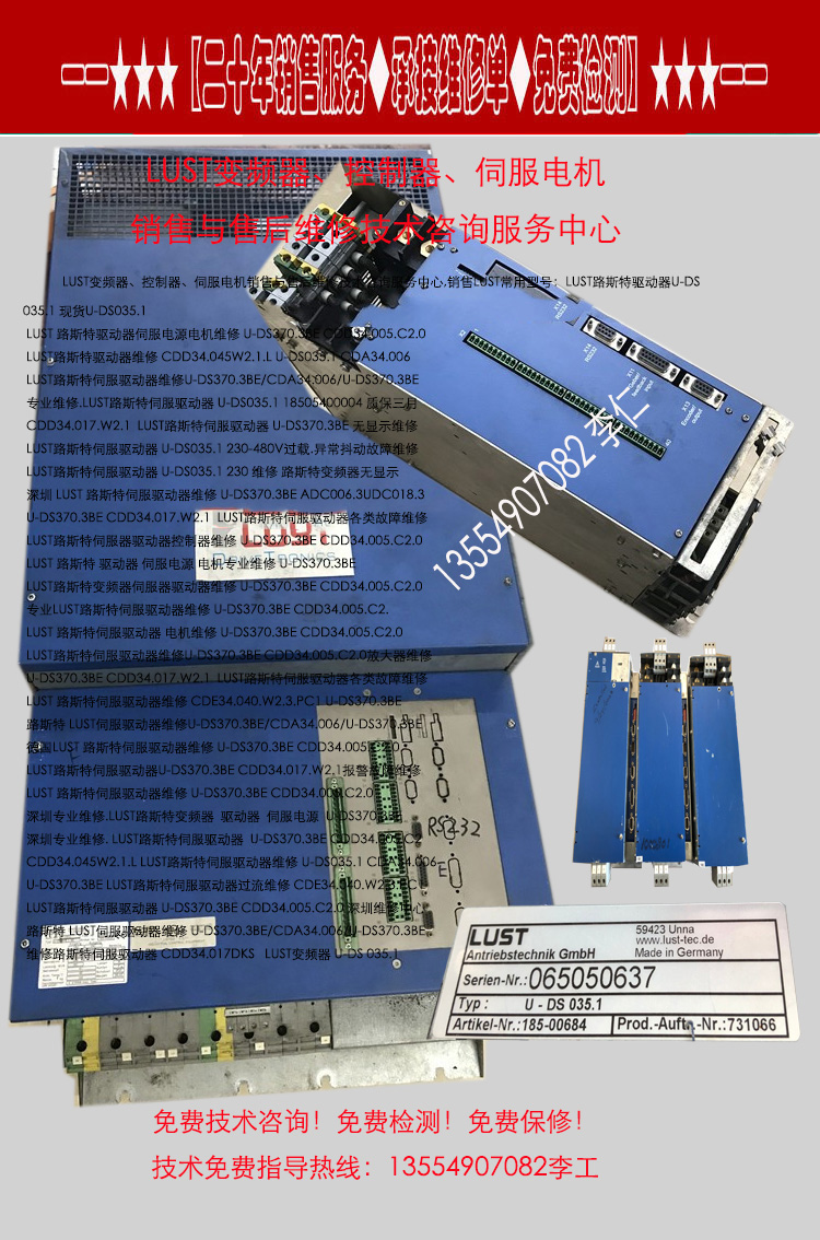 BDS0601,BDS1251,BDS1601;HS321BR,HS32200,HS322BR,HS342BR;ISA00,ISA01,OSA00,ISD00,ISD01,ISD02,ISD03,ENPO,OSD00,OSD01,OSD02,PTC1/2,IED00,IED07,OED00,ED03; 路斯特伺服驱动器CDD,CDA系列,LUST变频器,LIT驱动器,ENC故障处理,OC过流,过载维修,E-OLI故障报警等修理