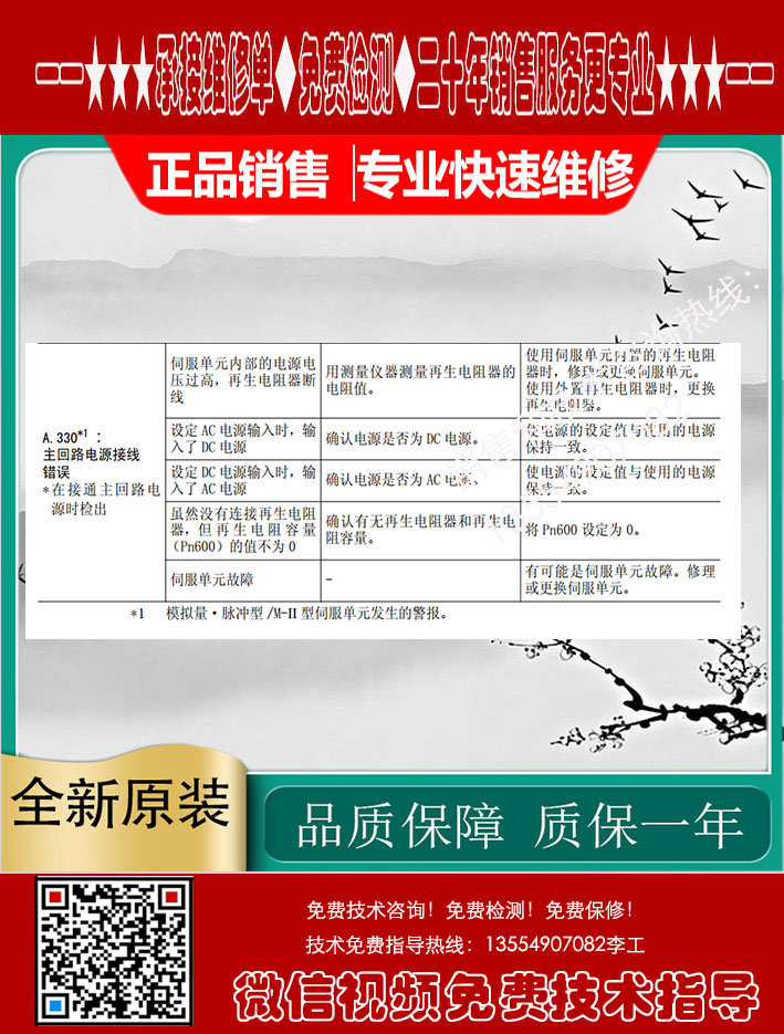 出现安川驱动器报警A.300故障的原因有以下这几个:1,可能外置电阻器的连接不良,脱落和断线会导致报警,我们就可以检查接线了。2,可能是电阻器连接端子B2-B3的跨接线脱落,这个时候再去看看跨接线是否有脱落, 3,可能是将电阻容量pn600设定为0以外的值,不安装电阻器导致,我们可以链接外置电阻,或在不需要电阻器是,将电阻容量设定为0。 4.可能是伺服驱动故障导致报警。如果出现了这种报警故障的话,你可以自己检查外部有没有问题,如果不是外部的问题,就需要维修了,而我们有维修服务可以提供,期待你的光临